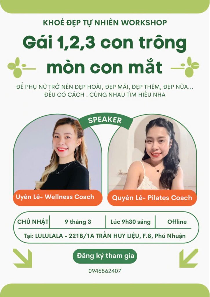 Hãy tham gia ngay workshop “Gái 1,2,3 con trông mòn con mắt” để cùng chia sẻ, học hỏi bí quyết chăm sóc sức khỏe và sắc đẹp dành riêng cho phụ nữ!